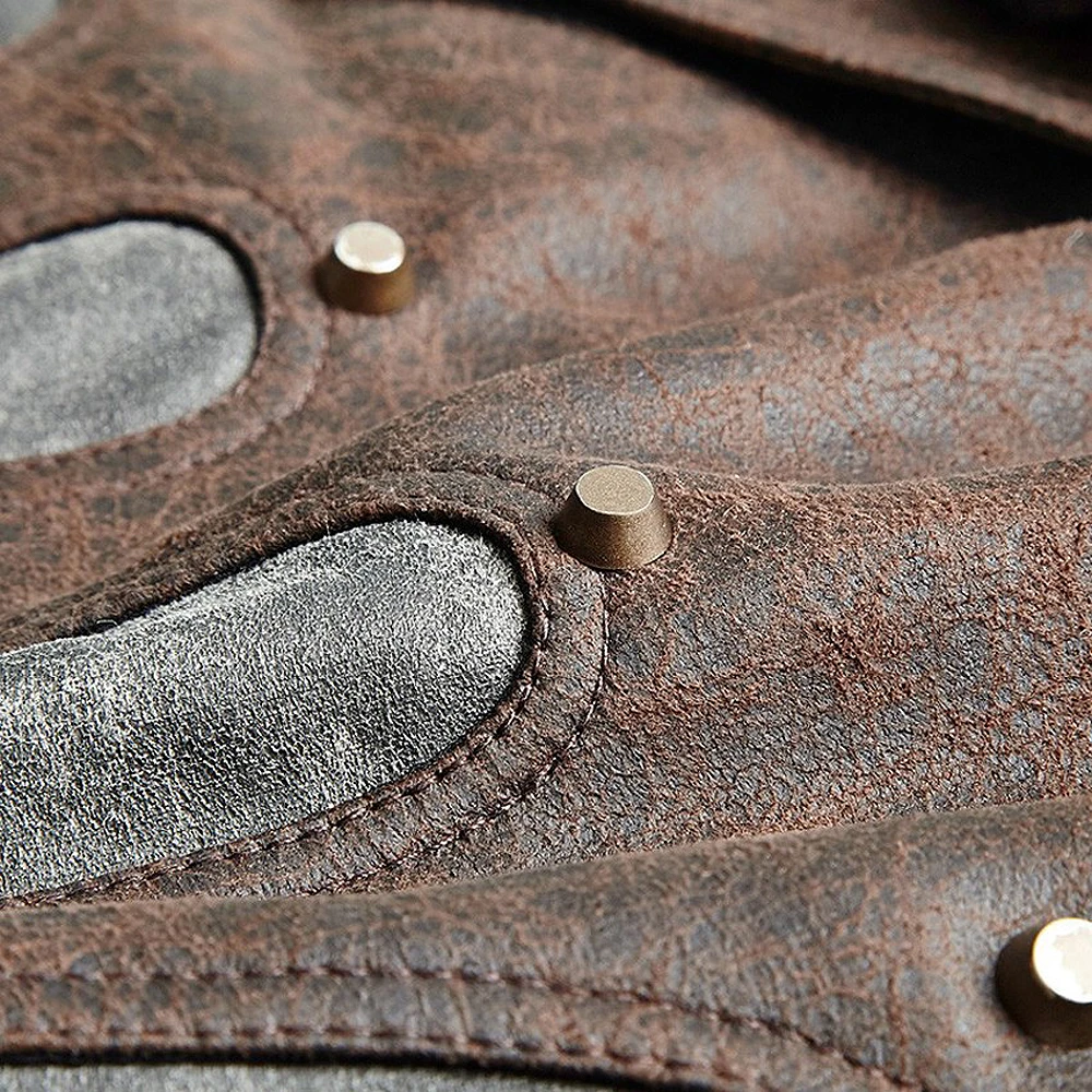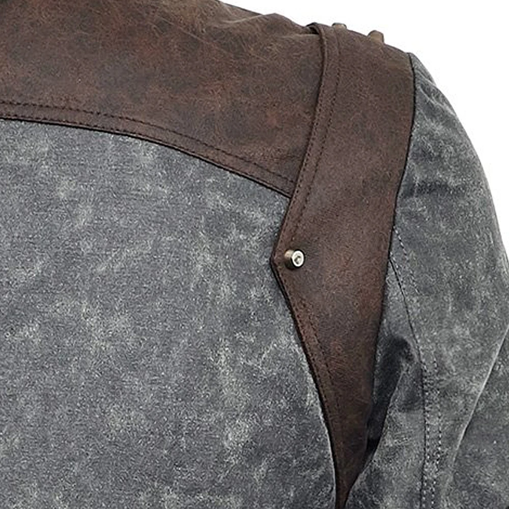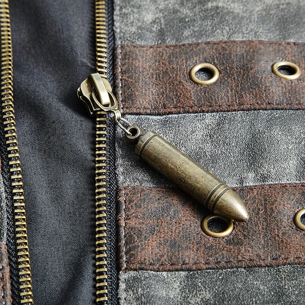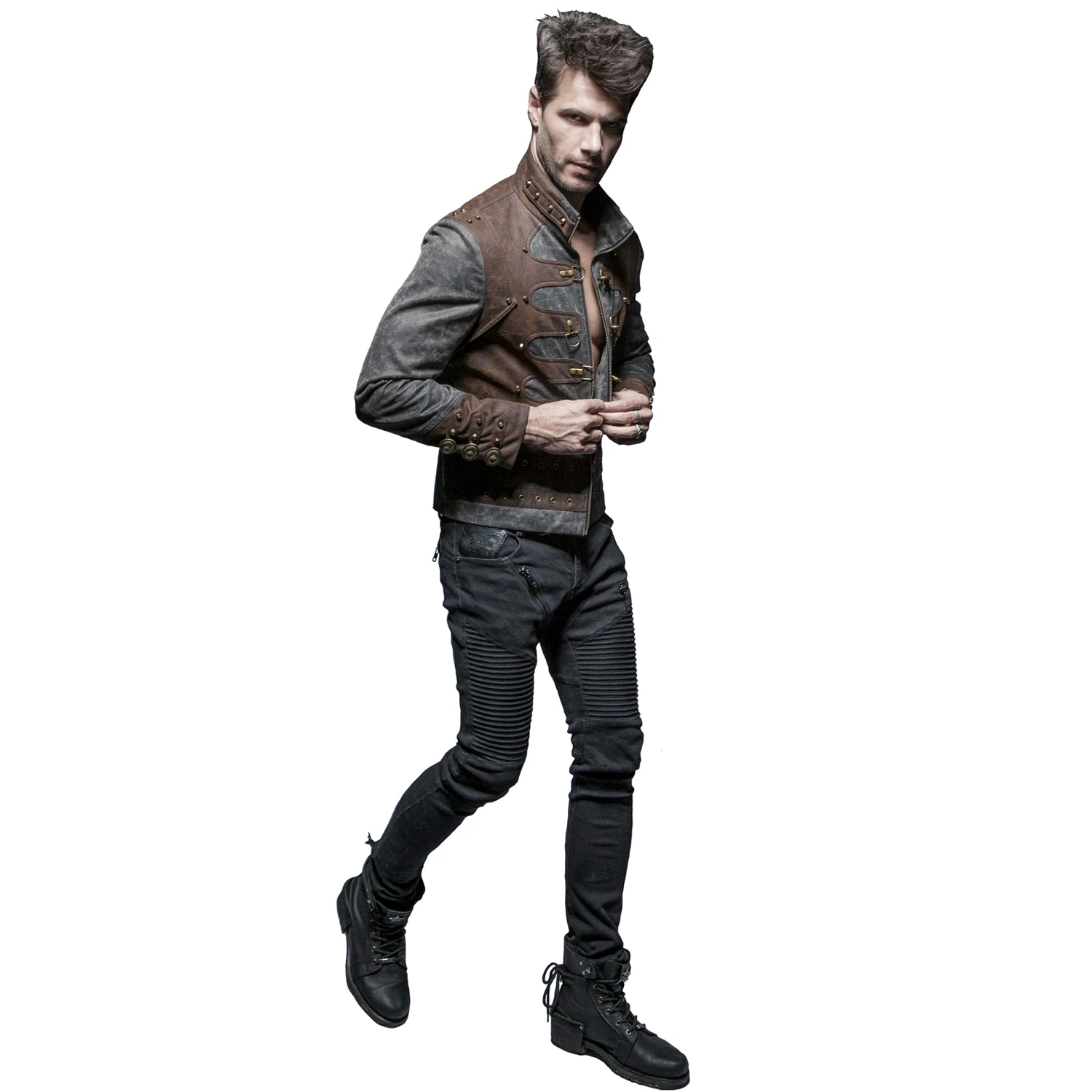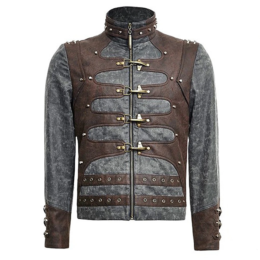 Veste homme de style steampunk noire lavée à la pierre et marron courte décorée avec des clous en bronze et des oeillets.