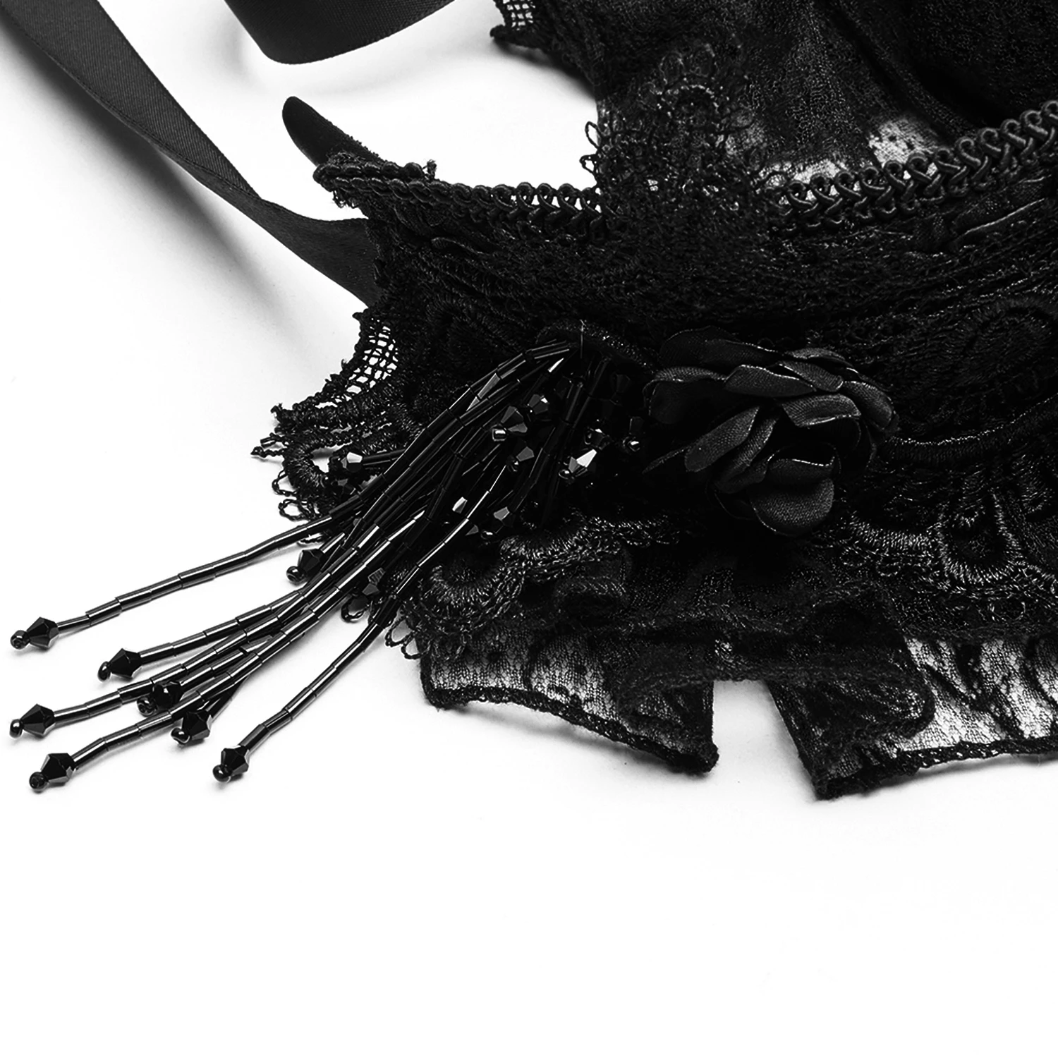 • Se ferme avec deux liens en tissu satiné noir aux deux extrémités.