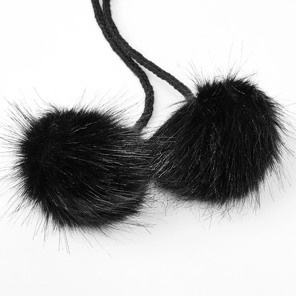 • Fermeture sur le devant avec des cordons terminés par deux pompons en fourrure.